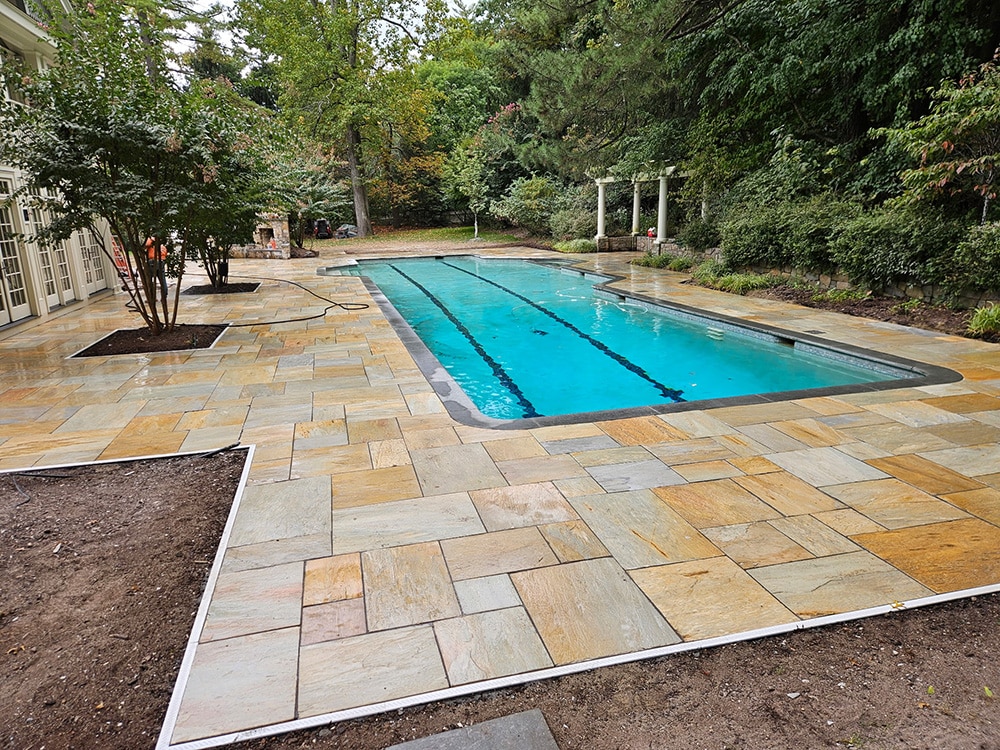 A medium White sandstone that will not heat up in the sun compared to darker stone. Smooth but not slippery surface